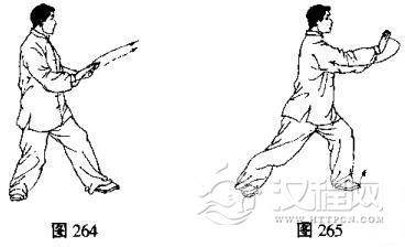 (2)两手在胸前翻掌,向下经腹前再向上、向前推出,腕部与肩平,手心向前,同时左腿前弓成左弓步,目视前方(图263, 264, 265)