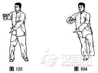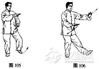 (2)上体微向左转,左脚向左前方迈出,右脚跟后蹬,右腿自然伸直,成左弓步,同时上体继续左转,左右手随转体慢慢分别向左上、右下分开,左手高与眼平(手心斜向上),肘微屈,右手落在右胯旁,肘也微屈,手心向下,指尖向前,目视左手(图105、106、107)。