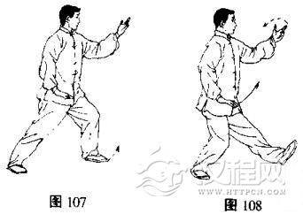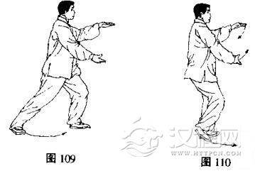(3)上体后坐,重心移至右腿,左脚尖翘起,微向外撇(大约45度一60度),脚掌慢慢踏实,左腿慢慢前弓,身体左转,重心移至左腿,同时左手翻转向下,左手臂内旋收至胸前平屈,右手向左上划弧至左手下,两手心相对成抱球状,右脚随即收到左脚内侧,脚尖点地,目视左手(图108,109,110)