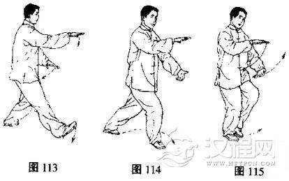 (4)右腿向右前方迈出,左腿自然伸直,成右弓步,同时上体右转,左、右手随转体分别慢慢向左下、右上分开,右手高与眼平(手心斜向上),肘微屈,左手落在左胯旁,肘也微屈,手心向下,指尖向前,目视右手(图111, 112)