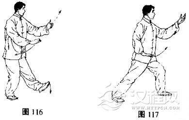 (6)左腿向左前方迈出,右腿自然伸直,成左弓步,同时上体左转,右、左手随转体分别慢慢向右下、左上分开,左手高与眼平(手心斜向上),肘微屈,右手落在右胯旁,肘也微屈,手心向下,指尖向前,目视左手(图116, 117)