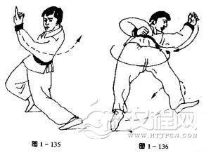 上动不停,如图1一134,重心继续向右前方移动,右手持杯经左后向右前方前伸、目视右前方。