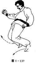 演练者左脚向右前盖一步,体先右倒,然后向左侧倾,右脚抬离地面,准备向左前盖步,右手随体右后摆动,左手左前摆动,目斜视左前方(图1一138)。