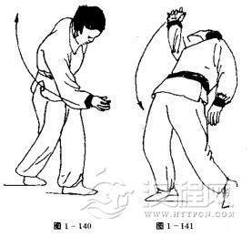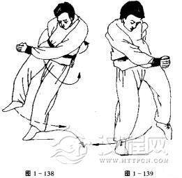 上动不停,右脚向左前方落步,身体向左侧倾,左手随体向左后摆动,右手向右前摆动,目斜视右前(图1一139)。
