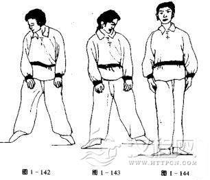 头摆正、脚后跟落地左脚向右靠一步,然后并步站立,两手伸直,五指向下贴于大腿侧,抬头挺胸,目正视前方(图1一144)