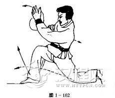 左手由上向下、向后,再向前挥出(图1一103),同时左脚上前,右脚猛蹬地面,向前跃出。右手后拉至体右后侧,目视前下方。