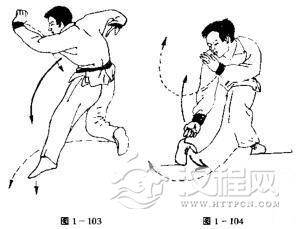技击要领:敌我均侧开门户,他以提吊手法攻击我时,我右前脚快落地之时突然拧身退步,同时以后脚猛地勾踢其前足,他必后倒。