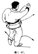 左脚向前进一步,体右后转.同时右手由前向后收回腰间。体前探,左手由腰间向前击出,右脚随体转向后抬离地面。目斜视左前方(图1一88)。