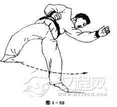 接上动,右脚向左前盖步,右手向右后自然摆动,目斜视左前方(图1一89)。