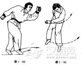 上动不停,右腿向左前大盖一步,身体向左转,两手随体转摆至体前侧。身体猛前俯,低头目视前下方,准备前窜〔图1一91)。