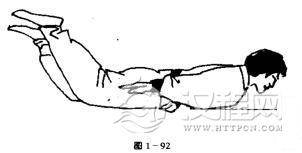 紧接上动。左脚上前,右脚猛向后蹬地,两掌前按地面并同时用力向后齐划、抬头、挺腹、反翘腿,脚背绷紧,脚底朝天,整个身体呈反弓形,借蹬划惯性,以腹部着地向前滑行。滑行时,两手臂伸直于体侧,手心向上,目视前方(图1一92)。