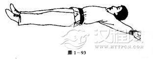 两脚伸直并拢、收腹,腿向上顶,上顶至肩背挨地时两肘向后弯曲,掌心朝下,四指于耳侧按地(图1一94)。