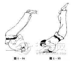 上动不停(图1一95),双腿继续上顶,两手使劲下按,将身体向上律起,头后仰、从两手中穿过,挺腹,体呈反弓状。