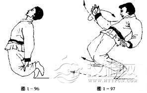 上动不停,身体呈反弓状向后倒下。下落至腹腿着地时,两掌使劲推地,使膝盖着地,上身向后翘起,头后仰,目视前上方(图1一96)。