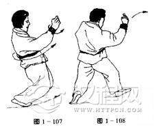 上动不停,随体旋转右脚上前一小步,重心向右前移出,左手曲臂护于胸前,右手屈肘,小臂上竖,左脚向左点地,准备侧摔,目藐视右前方(图1一108)。