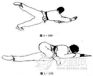 上动不停,右手前伸,左手屈肘,掌心向下,虎口朝前倒于地上.倒地后右腿伸直,右膝弯屈,脚尖反点地上,目斜视前方(图1一109、l一110)。