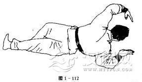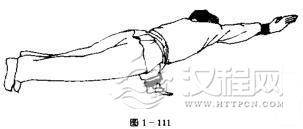 演练者抬头,两手同时按地,上身撑起(图1一111),两手后撑,拖腿,向前侧行,右掌向前伸出。全身复又扑倒地上。