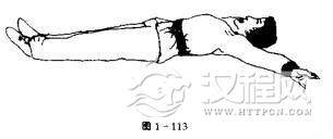 如图1一113所示,演练者头向杯侧转,欲喝酒,未成,反仰身摔倒,两手平伸于体两侧,掌心向上,目微闭,两腿挺直。