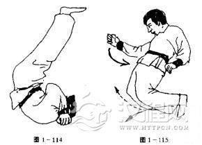 演练者两腿收腹上举,并折叠于体前,双手屈肘反按地面,然后猛地上蹬、挺腹,两手反推地面〔图1一114)。