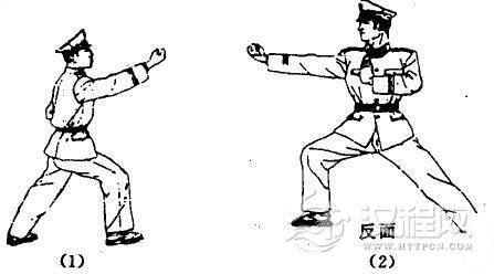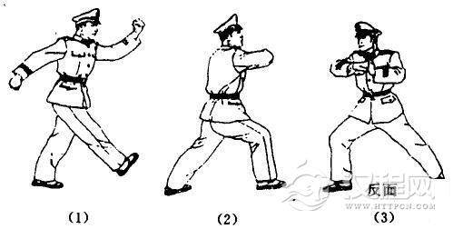 要求:反弹、穿掌要快,冲拳要猛。用途:反弹砸面,击肋、腹部。