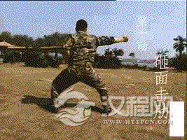 动作要领:(1)左转身成左弓步的同时,右拳由下向前猛力勾打,左臂自然后摆,目视右拳;(2)左手向前上方插掌,掌心向右,随即右手抓握左手腕,目视两手;(3)左手握拳,右转身成右弓步的同时,两手猛力后拉下压腹前,目视前下。