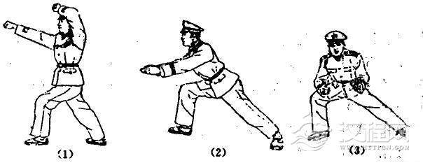 动作要领:(1)左转身成左弓步的同时,左臂上挡,拳心向前下,右拳猛力向前冲出,拳心向下,目视前方;(2)右脚向前上步成弓步的同时,两拳变掌前插,拳心相对,手略与膝同高,目视两手;(3)左转身,右肩猛力前顶的同时,两掌屈指猛力后拉于体前,两小臂略平,与裆部同高,目视前下。