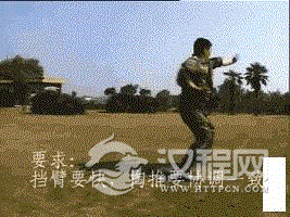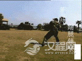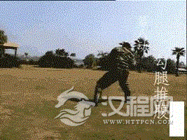 要求:勾腿要快,推击要猛。用途:勾脚跟,推击腹部。