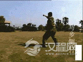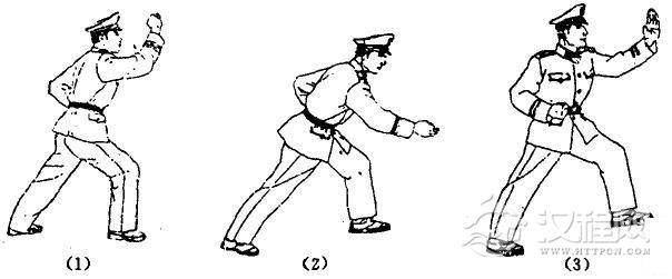 动作要领:(1)右脚向前上步成弓步,同时左手变八字掌置于左胸前,右手变拳自然后摆,目视前方; (2)左转身成马步的同时,左手挡抓、拧拉于腰际,右拳由后向前猛力侧打,目视右拳。