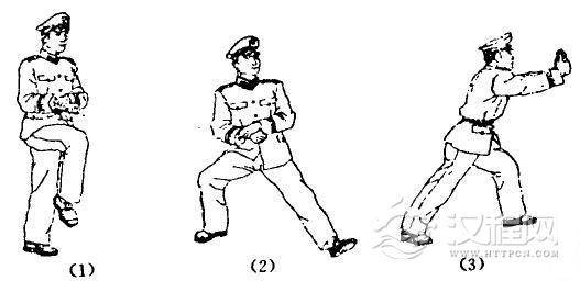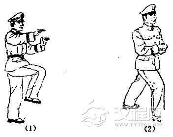 动作要领:(1)左脚向右踮步的同时,右大腿抬平,脚尖里勾,两臂弯曲,置于胸前,掌心向下,目视前方的同时;(2)左手抓握右手腕,右手变拳,猛力后拉,下压于胸前,成右弓步,目视前方。