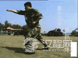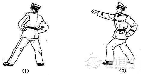 动作要领:(1)右后转身,左脚向前上步,重心落于右脚,同时,左臂经胸前下砸于腹前,右拳收于腰际,目左视;(2)重心移至左脚成左弓步,同时右拳向前冲出,左臂自然后摆,目视前方。