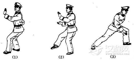 动作要领:(1)左脚向前上步,膝微屈,脚尖向外,同时,左手变八字掌置于胸前,手略高于肩,右手变拳收于腰际,目视前方;(2)起右脚经体前猛力后绊的同时,左手挡抓、拧拉于腰际。右拳猛力向前冲出,拳心向下,成左弓步,目视前方。