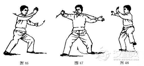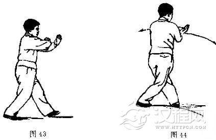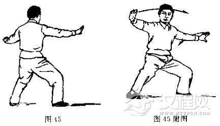 动作与第八式“斜行拗步”动作同,唯衔接动作稍异,仍可用第八式的说明来配合着参看图照。(图46-48,再接35-38。图46是衔接图45的正面图的方向而下,其实动和左脚上步的方向仍与第八式同,是向着东北斜方上步的)