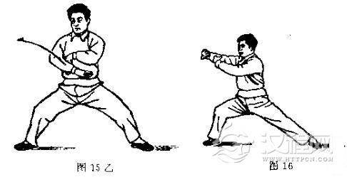 动作一:身微左转,重心左移,左腿变实;同时两手先各在原处旋臂划一小圈(以引起动作),即右手大顺缠转臂捋至腹前,左手小逆缠拥至胸前,两手形成合劲;身体微右转,重心右移,左手以大拇指一侧贴近右胁向里滚转,成手心向左,右手逆缠使手心翻朝下(图15甲、乙)身微右转’重心右移,右腿变实;同时,右手转臂顺缠、左掌小逆缠’两手合住劲,向右上方弧形挤出。(图16)