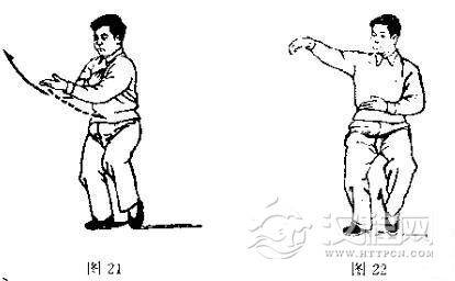 动作一:身微右转即向左转回;同时右手顺缠向内、左手逆缠向外各翻一个圈,随即右手变勾手右举,左掌弧形移至腹前,在身体左右旋转时,左脚也随着以脚尖点地辗转。(图21- 22)