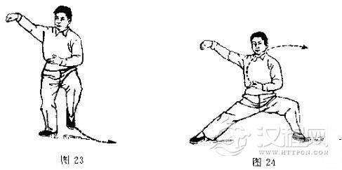3.太极拳要求意气须换得灵,单鞭就是一个好例子,左手左缠时意注左手,待到完成身体转正时,意又转注于右手上,所以图25与26不同,前者意注左手,后者已移转到右手。