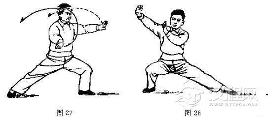 3.图28中的姿势,是两膊相系着经过左逆、右顺各缠一圈后而形成的,同时是两膊相系下合住劲,运用以腰脊为轴的身法来完成的。
