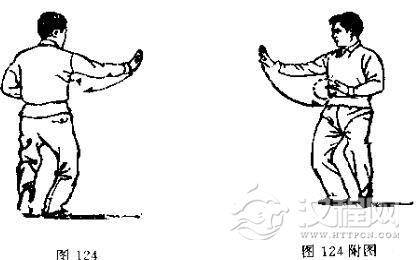 动作二:身体左转,重心移于右腿。同时,右手转臂逆缠至右手旁,掌心斜朝里;左手小顺缠向右合,掌心朝上。(图1 2 2)以右脚跟为轴,身体继续左转,重心全部移于右腿,左脚提回,经右踝内侧向后(西)撤步,以脚尖点于右脚旁,两脚距离同肩宽。同时,左掌屈臂逆缠收回至左腰侧,掌心朝上;右掌顺缠向前推出,掌心朝外。(图123 -124,附图1 2 4正面图)