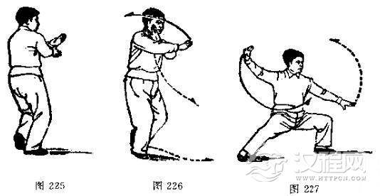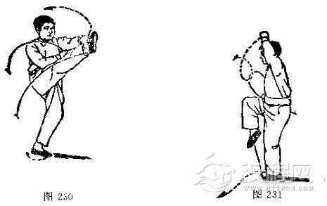 2.由于左掌交叉地拍击右脚面外侧,所以称为十字摆莲。拍后以左拳上举、右拳下翻同时发劲,以这种发劲的协调来取得转体后的稳定。