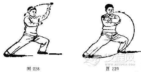 2.由于此式横向动步,因此极易表现出对圆裆的要求。圆裆是产生腿部缠丝暗劲所必具的形式。正确而标准的圆裆,就是不要形成高站而尖裆、低站而荡裆,要求在不尖不荡的情况下进行动作,以达到正确的圆裆。