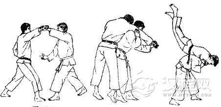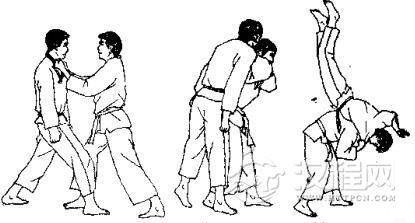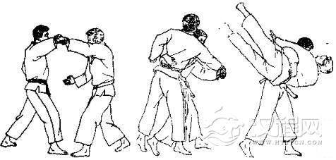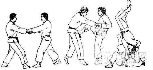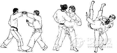 1.对方用双手抓住我衣服。2.对方向左迈左脚并左转体,用两手抓背我。3. 对方俯身弓背,继续拉我衣服,将我背摔。 4. 我被摔倒准备反踢。 5. 我反踢其心窝。