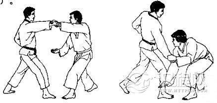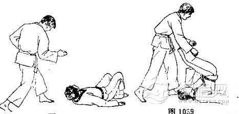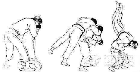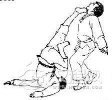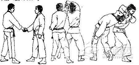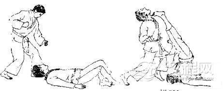 1.对方用左手抓住我右臂。2.对方右臂插人我裆部并上抬,同时向前迈右脚。3.对方一手拉臂,一手穿裆,同时向左迈左脚并左转体,将我扛起。 4.我倒地后,对方准备再踢我。 5.我用右脚趾朝其心窝处反踢。