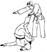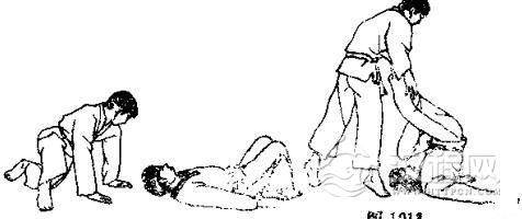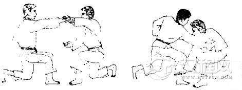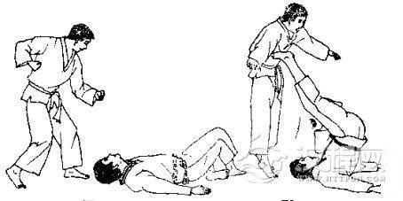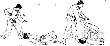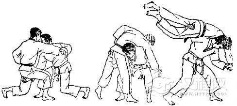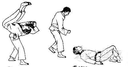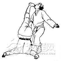 1.我用右臂搂住跪在地上的对手膀子,左手抓住自己右臂。2.对方突然用左手拉我右臂,并用右手抓我右肩衣服,同时迈 左脚起身。3. 对方向前拱背低头,同时继续拉臂和衣服,将我背摔起。 4. 我被摔倒后,交叉双腿准备反击。 5. 我用右脚反踢对方心窝。