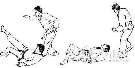 1.对方用两手抓我两臂。2.对方拉我两臂,并用右脚踹我肚挤部。3. 对方后拉我双臂并倒地向后蹬我腹部。 4. 对方准备爬起再踢我,我则两腿交叉准备反踢。 5. 我用右脚反踢其心窝。