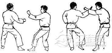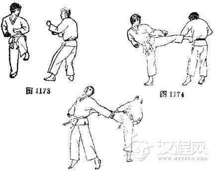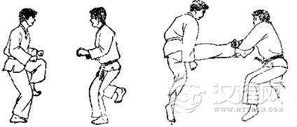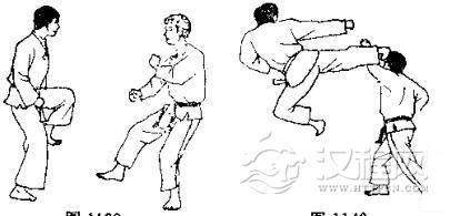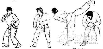 1.双方准备格斗,对方右脚半月踢击我右臂,我同 时收右手右脚。2.对方向左转体提右膝,准备起跳。3. 对方跳起以左脚半月踢击我颌部,我撤右脚向后躲闪。 4. 对方准备侧踢。 5. 对方用左脚侧踢我肋部,我用左臂外挡。 6. 我反以左脚猛踢其腰部。