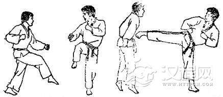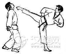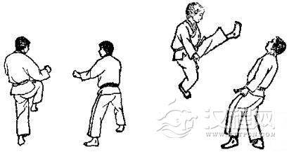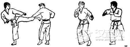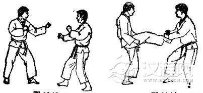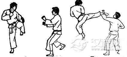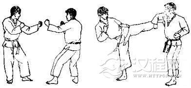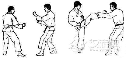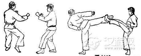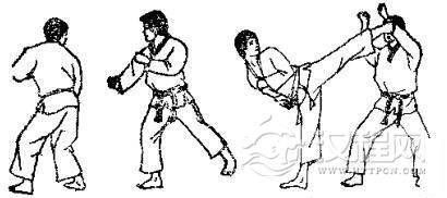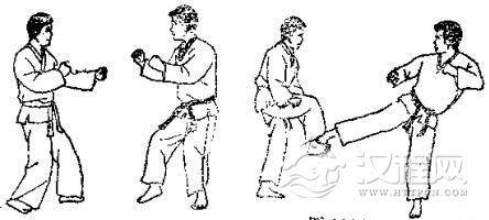 1.准备格斗,对方用左脚踢我腹部,我用交叉拳下挡。2.对方准备跳踢,对方跳起后前踢我下巴,我一面用交叉拳下挡,一面向后跳。3. 对方落地后,我即准备踢打,然后用右腿转踢对方腹部。