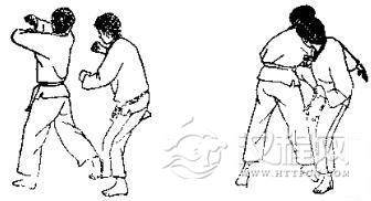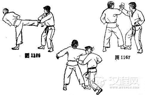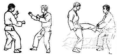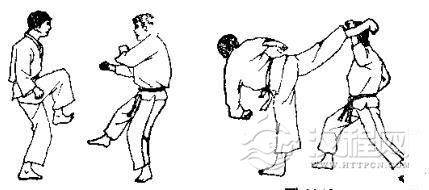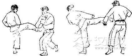 1.双方准备格斗,对方虚以左手刀击我脖子,并准备侧踢,我则以右臂外挡。2.对方用左脚猛踢我肋部,我用左臂外挡,同时拉其腿。3. 对方收腿准备后侧踢。 4. 对方用脚背踹我心脔,我用两拳下挡,同时撤左脚。 5. 对方再以右拳击我颁部,我以右臂外挡。 6. 我用左拳击其肾部。