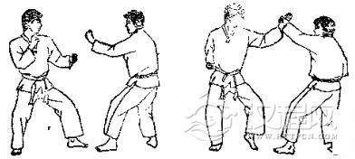 1.双方准备格斗,对方左脚半月踢我左臂,我同时回收左手及左脚。2.对方准备转身反踢。3. 对方用右后脚跟转身反踢我脖子,我向后撤,并屈身躲闪。 4. 对方再用左拳击我脸,我以右臂外挡。 5. 顺势出左拳击打对方人中或下巴。