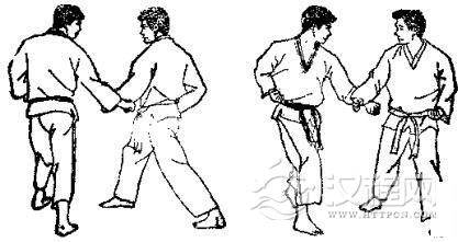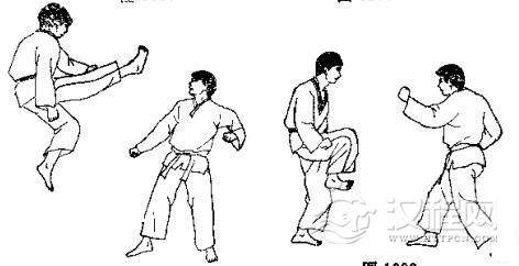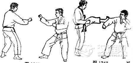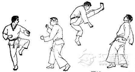 1.准备格斗,我先假以右指戳其眼珠,被对手用右手刀挡开。2.我用右脚转体踢其下腹,对方向右迈右脚,用左臂外挡我腿。3. 放下右脚的同时,我又以左手刀向内击砍其脖,被对方右臂外挡。 4. 我提左膝向右转顶其肋,被其双拳下压大腿。 5. 放下左脚的同时,又以右肘侧击其颌部。