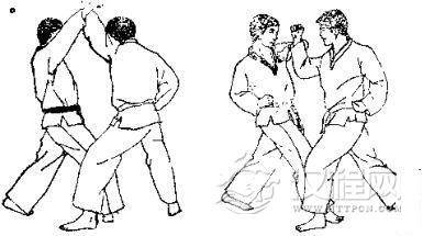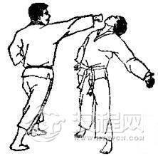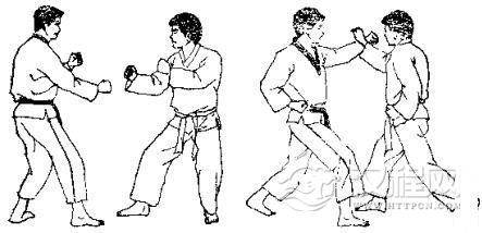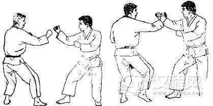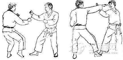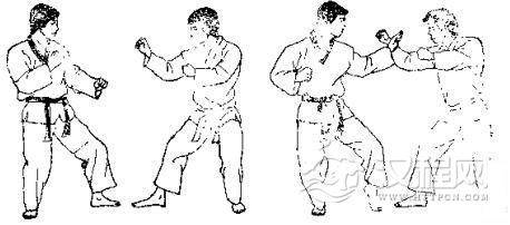 1.准备格斗,我前上右步,出左拳逆攻其下领,对方用右臂外挡。2.我左转体侧身用右拳攻其肋部,同时迈左脚,对方用左臂外挡。3. 我身体右转以左拳击其心窝,被对方右臂外挡。 4. 我再以右拳正击其人中穴。