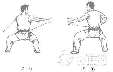 右脚向前上半步,脚尖内扣,双腿屈膝半蹲成马步;同时腰向左转约9 0 ° ,右拳随体转向右侧冲出,拳眼朝上,臂与肩平;左掌随屈肘收至右胸前,掌心朝右,掌指朝上;目视右拳( 图 1 5 5 ) 。